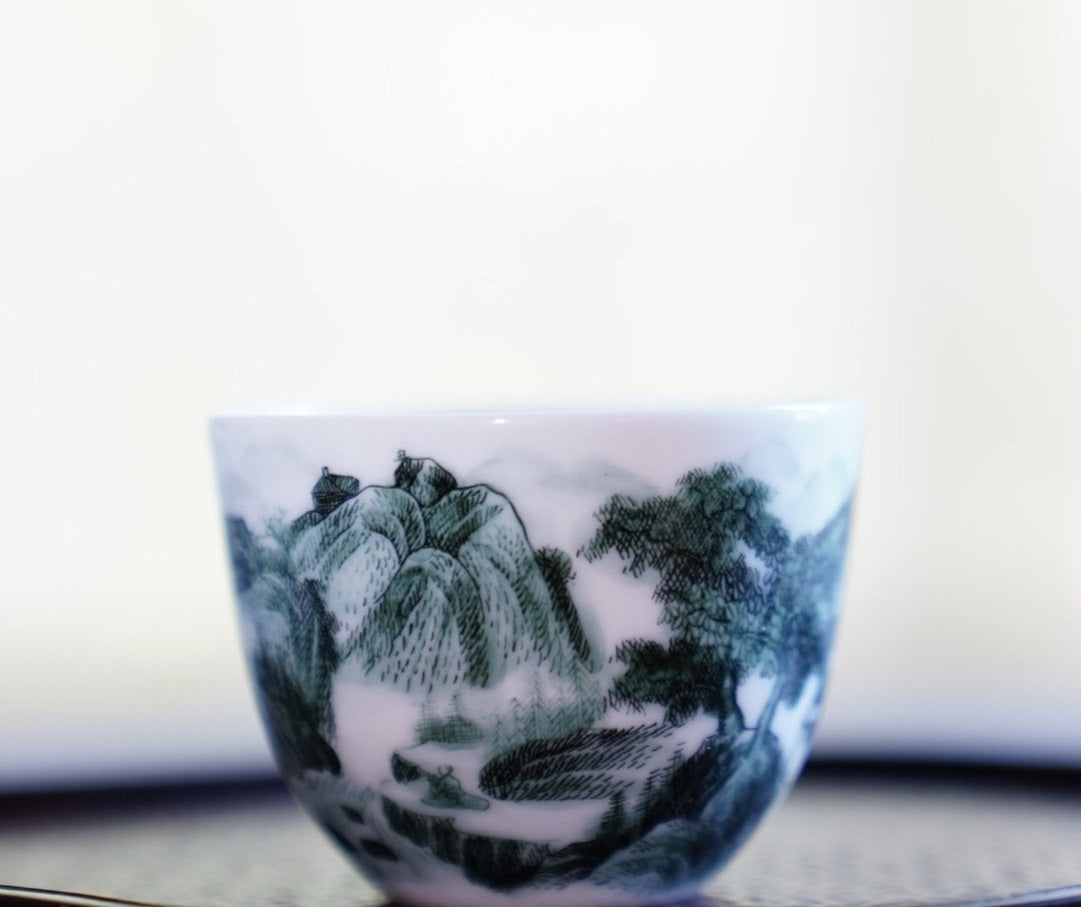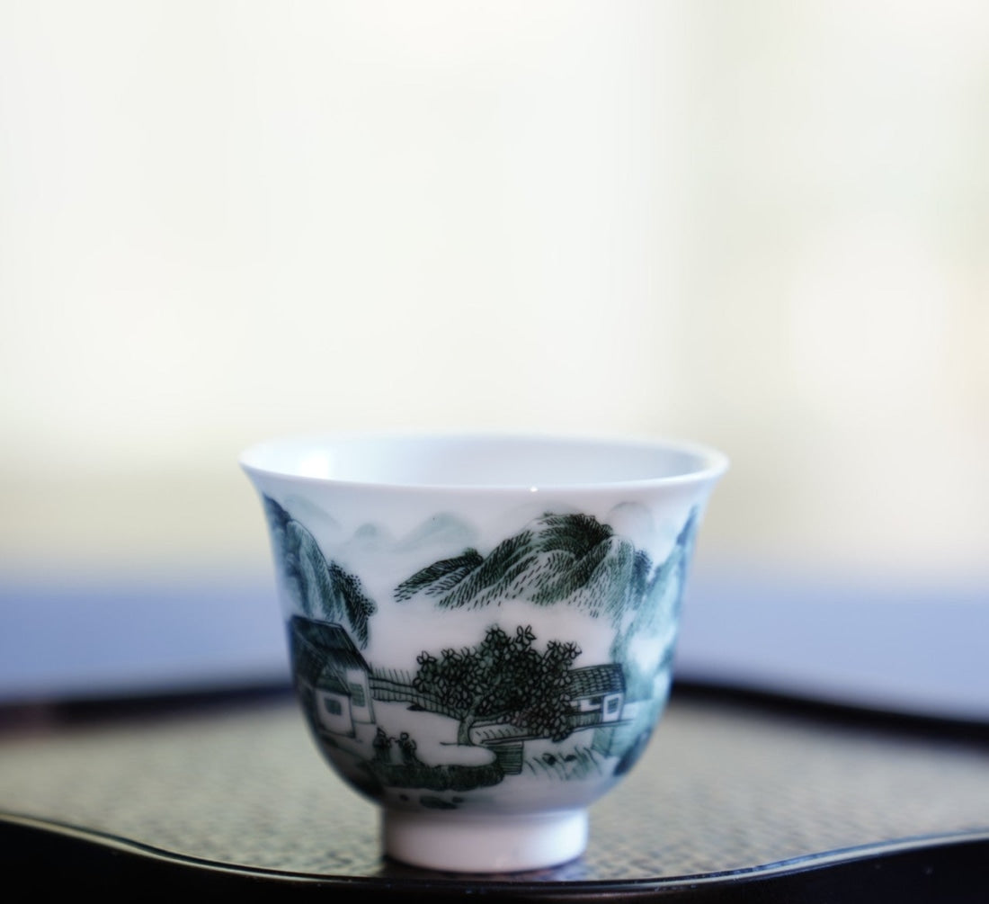 Jingdezhen Artisan Deep Green Painting Porcelain Teacup Distant Mountain