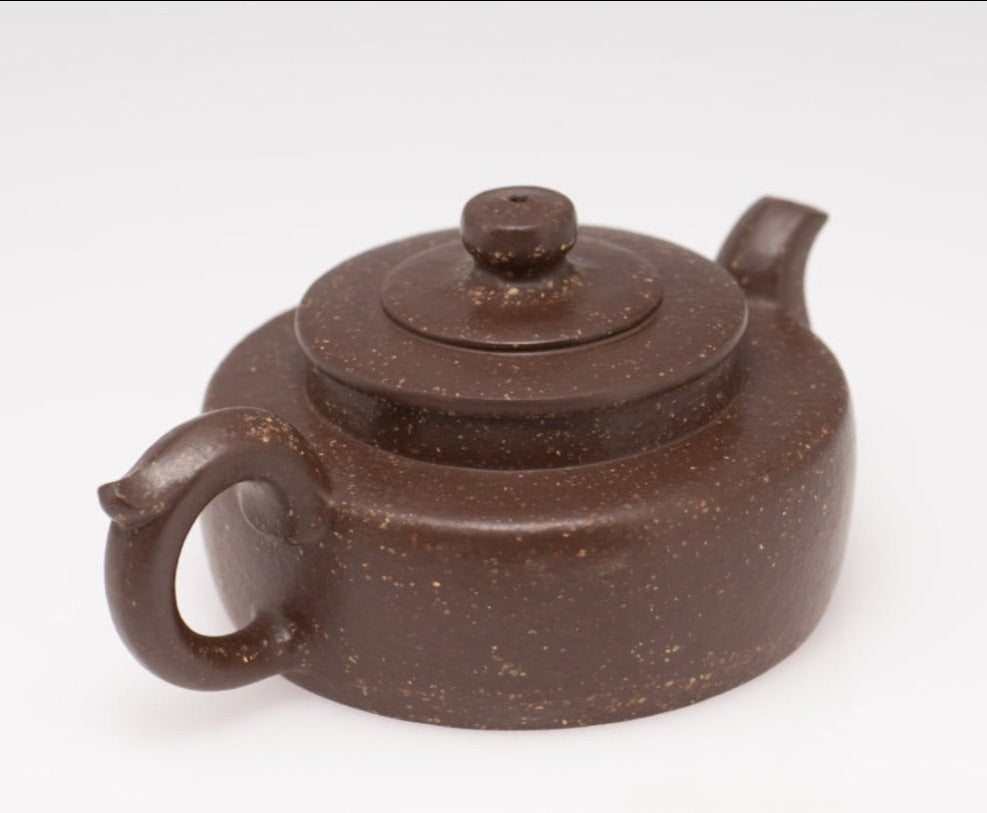 The very essence of the teapot is not only expressed in its exquisite form, but also in the visual texture of the clay material. Zisha clay particle has a grading system for the refinement of the clay material called Mu (目数) or mesh number. The bigger number of Mu, the finer the ground are the particles of the clay material. This pot has 12 Mu, compared to the normal Zisha clay of 40-60 Mu. Master Yu personally hand-ground the clay material, so the clay has a relatively coarse or larger particle texture as opposed to machine-ground fine clay as you can see on the pictures. Because it is hand-ground, this is the most porous material and utmost breathability of a Zisha clay. A high caliber clay material that Zisha collectors love to pursue.