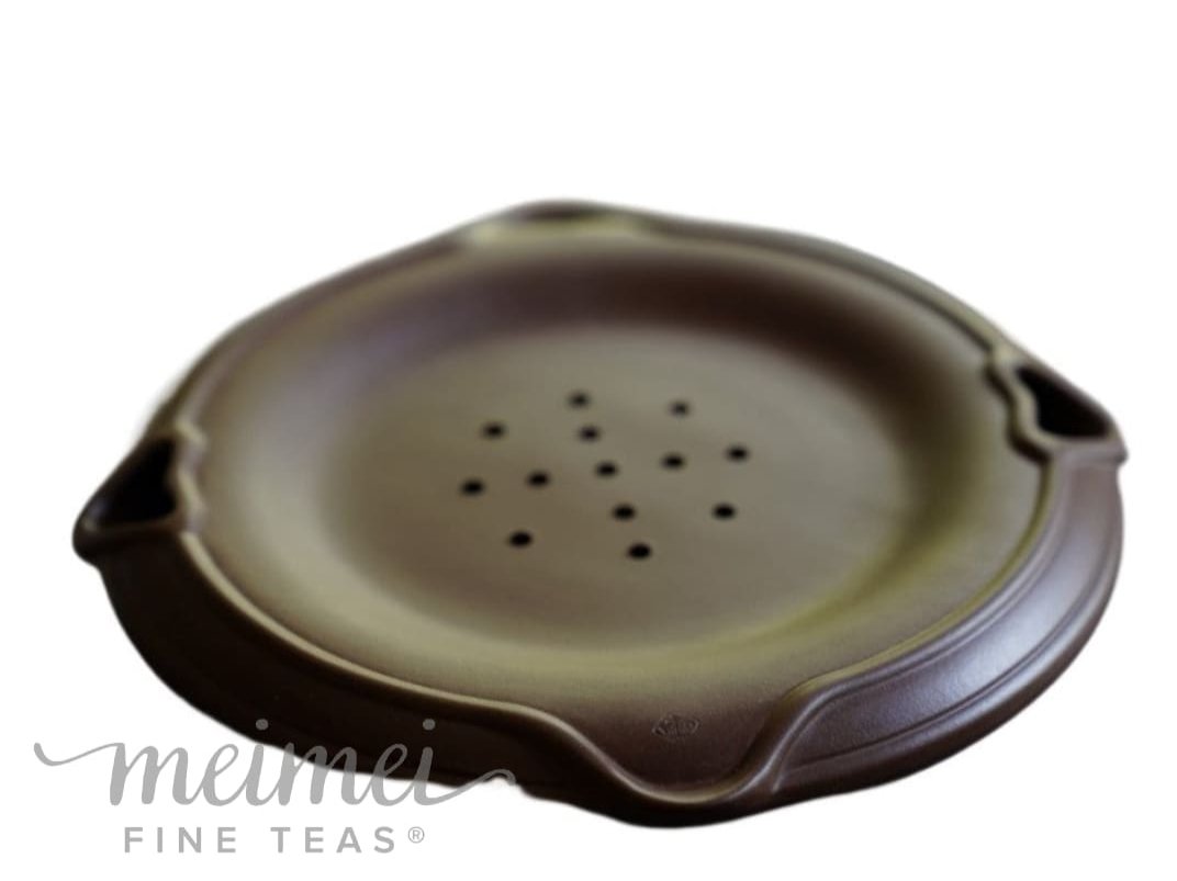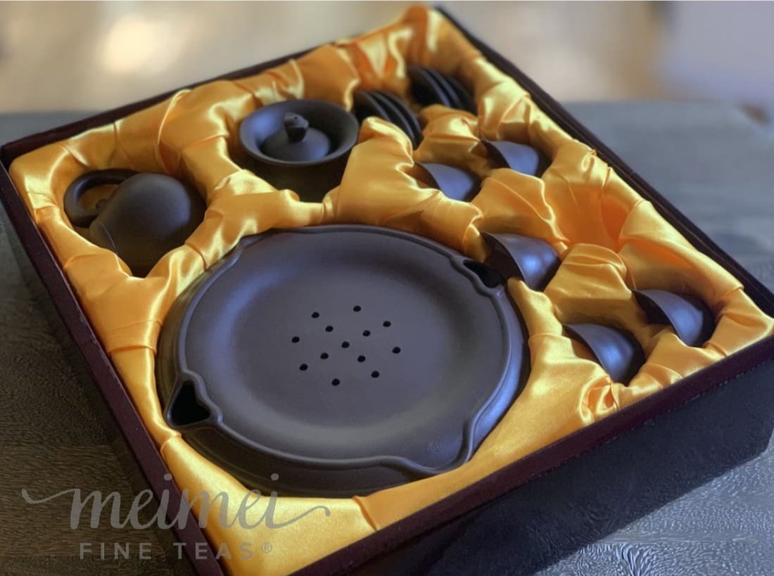 This Yixing Zisha gongfu tea set includes a teapot, a fair cup with removable strainer, five tea cups, and a teapot base with drain and reservoir. The set is inspired...